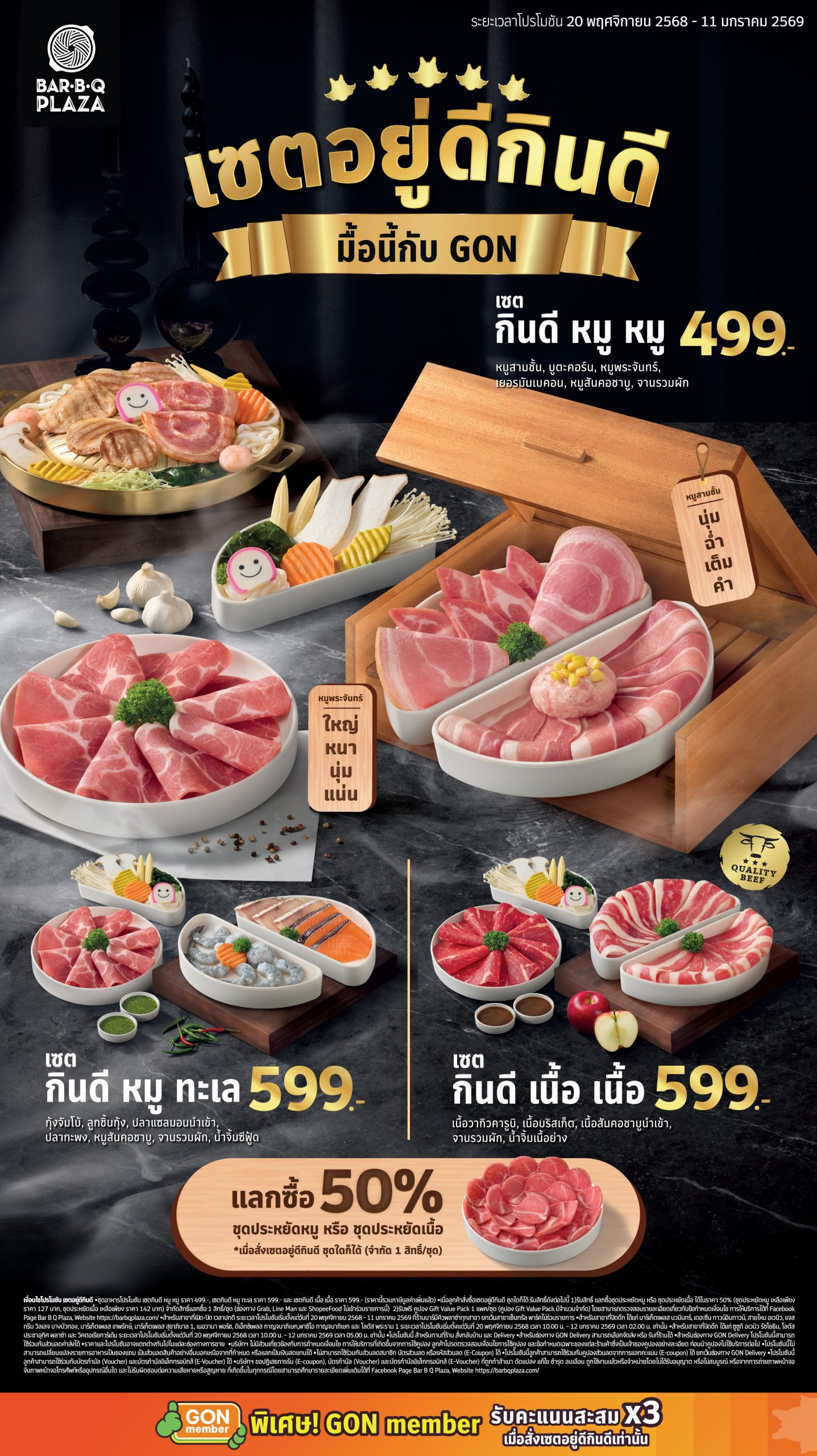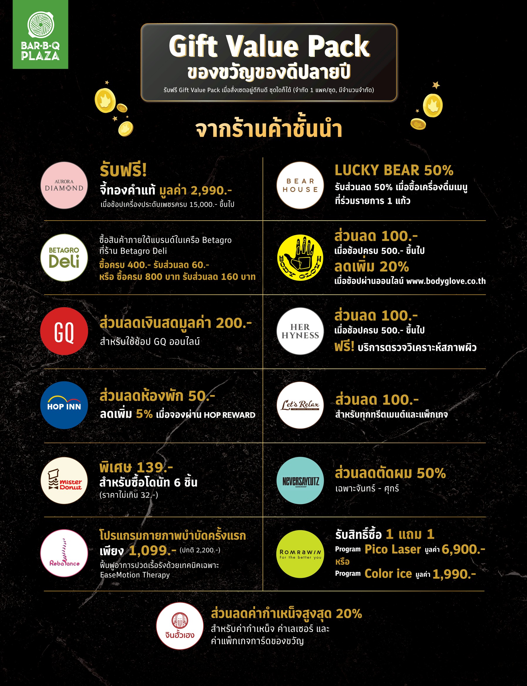 - รับฟรี คูปอง Gift Value Pack 1 แพค/ชุด (คูปอง Gift Value Pack มีจำนวนจำกัด) โดยสามารถตรวจสอบรายละเอียดเกี่ยวกับข้อกำหนดเงื่อนไข การให้บริการได้ที่ Facebook Page Bar B Q Plaza, Website https://barbqplaza.com/