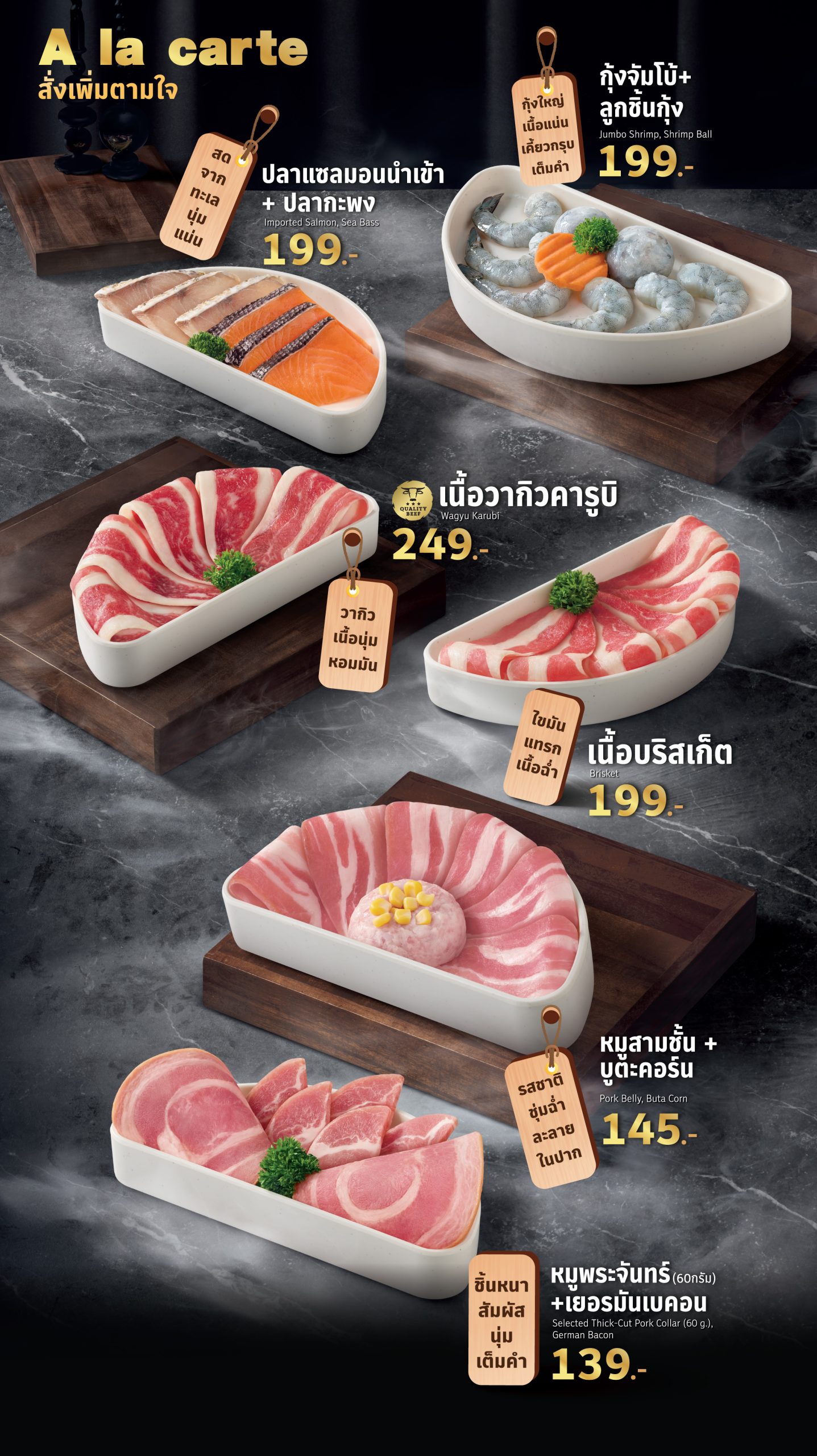 - ชุดอาหารโปรโมชัน เซตกินดี หมู หมู ราคา 499.-, เซตกินดี หมู ทะเล ราคา 599.- และ เซตกินดี เนื้อ เนื้อ ราคา 599.- (ราคานี้รวมภาษีมูลค่าเพิ่มแล้ว) ·เมื่อลูกค้าสั่งซื้อเซตอยู่ดีกินดี ชุดใดก็ได้ รับสิทธิ์ดังต่อไปนี้