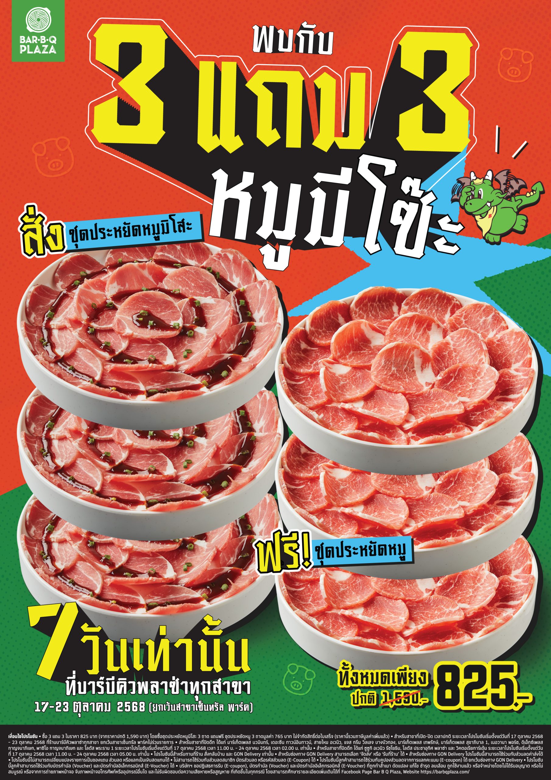 - สำหรับสาขาที่เปิด-ปิด เวลาปกติ ระยะเวลาโปรโมชันเริ่มตั้งแต่วันที่ 17 ตุลาคม 2568 – 23 ตุลาคม 2568 ที่ร้านบาร์บีคิวพลาซ่าทุกสาขา ยกเว้นสาขาเซ็นทรัล พาร์คไม่ร่วมรายการ