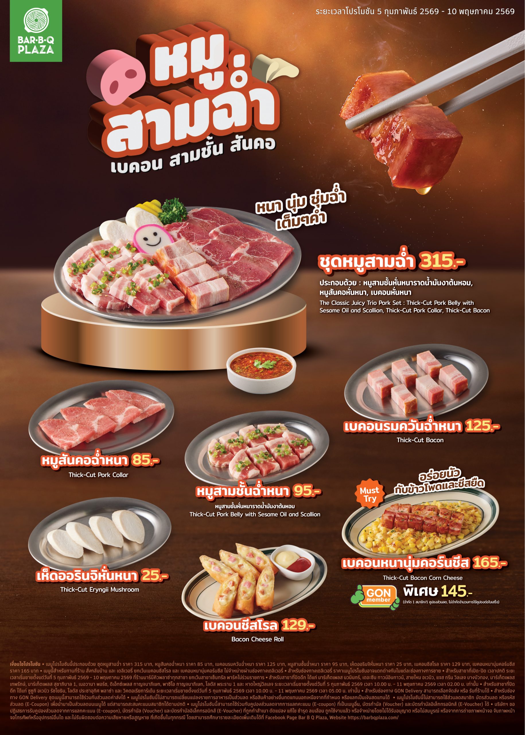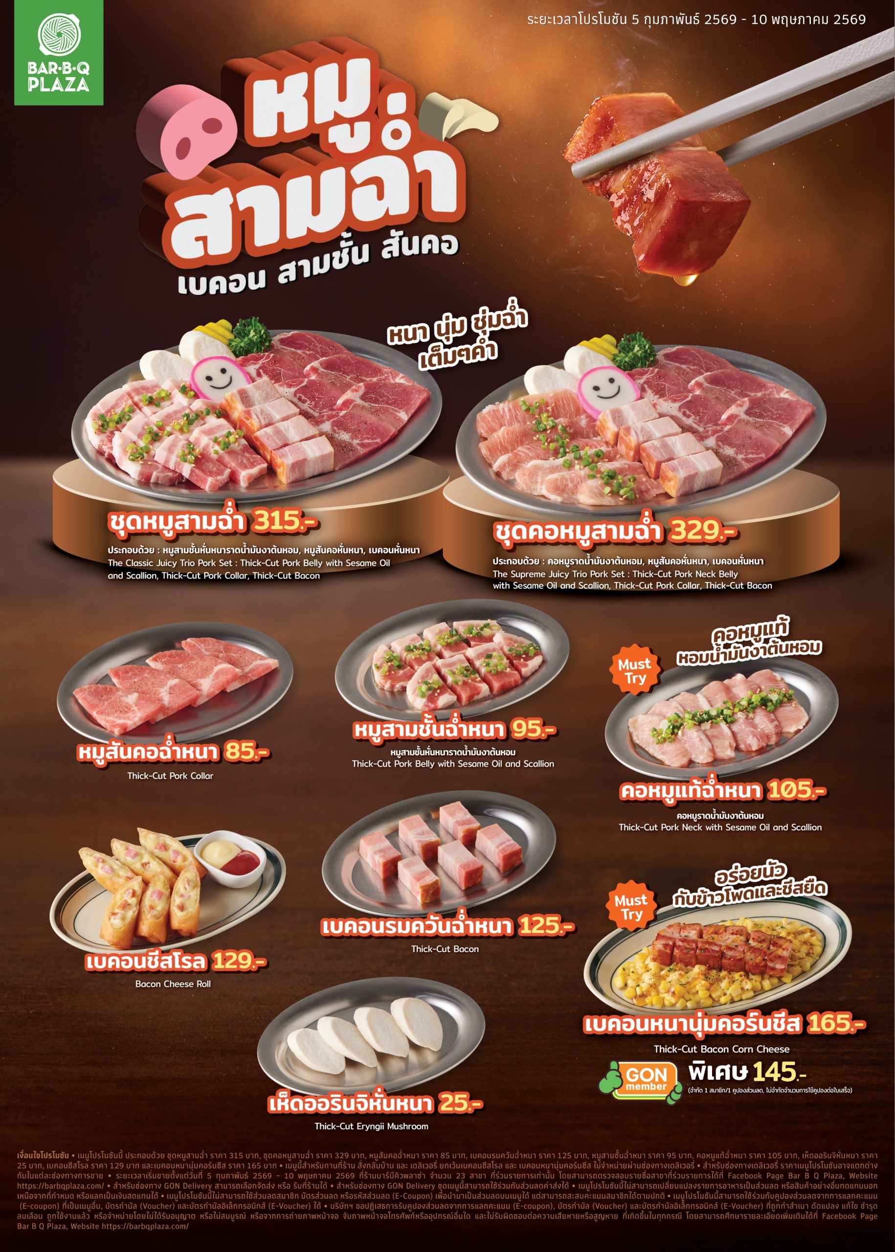 - สำหรับสาขาที่เปิด-ปิด เวลาปกติ ระยะเวลาเริ่มขายตั้งแต่วันที่ 5 กุมภาพันธ์ 2569 – 10 พฤษภาคม 2569 ที่ร้านบาร์บีคิวพลาซ่าทุกสาขา ยกเว้นสาขาเซ็นทรัล พาร์คไม่ร่วมรายการ