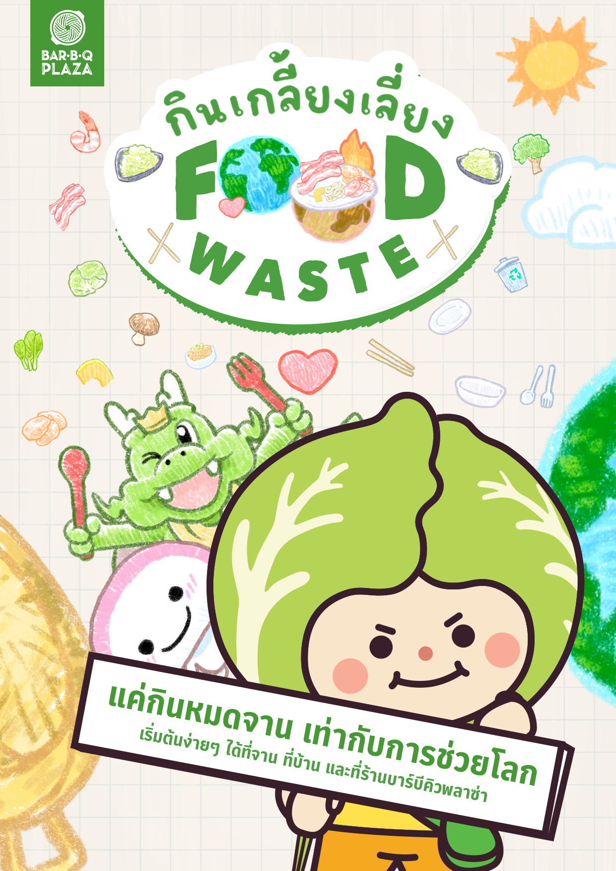 “เริ่มต้นที่จาน=การช่วยโลก” บาร์บีคิวพลาซ่า เปิดตัวมาสคอตใหม่สายกรีน ‘น้องกะหล่ำ’ อ้อนลูกค้าร่วม #กินเกลี้ยงเลี่ยงFoodWaste รับวันอาหารโลก